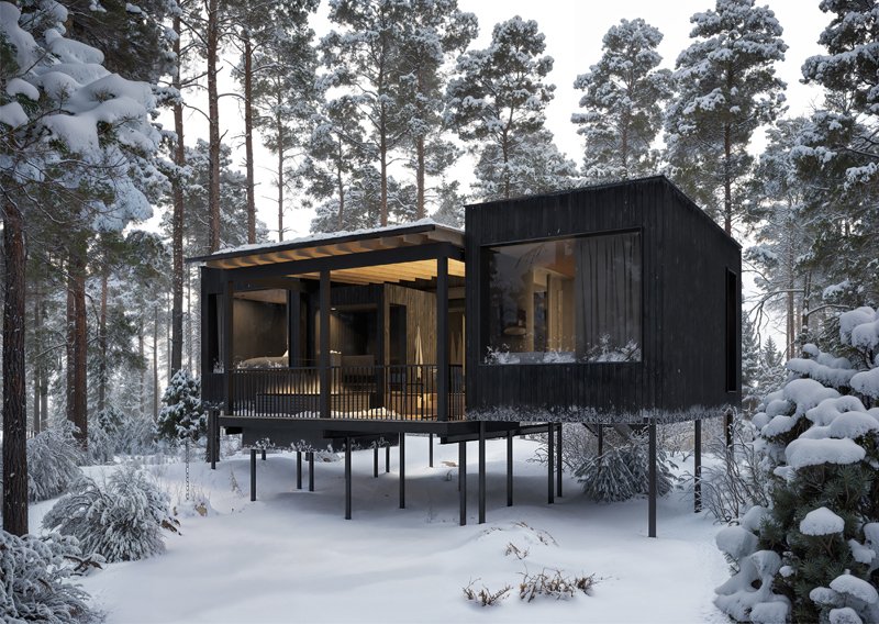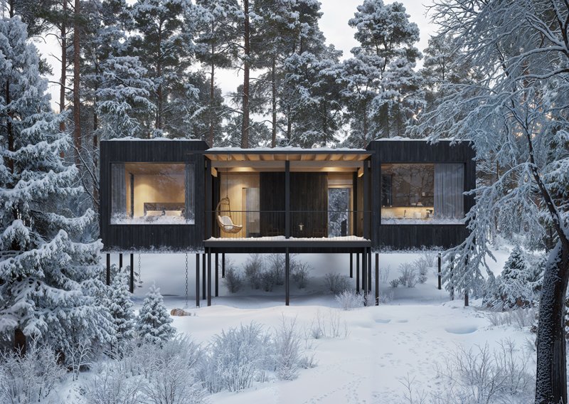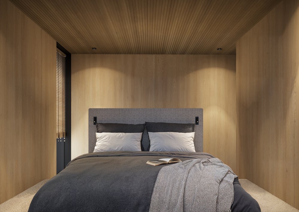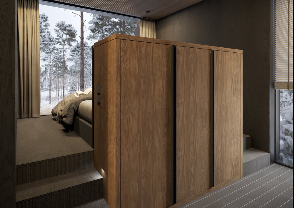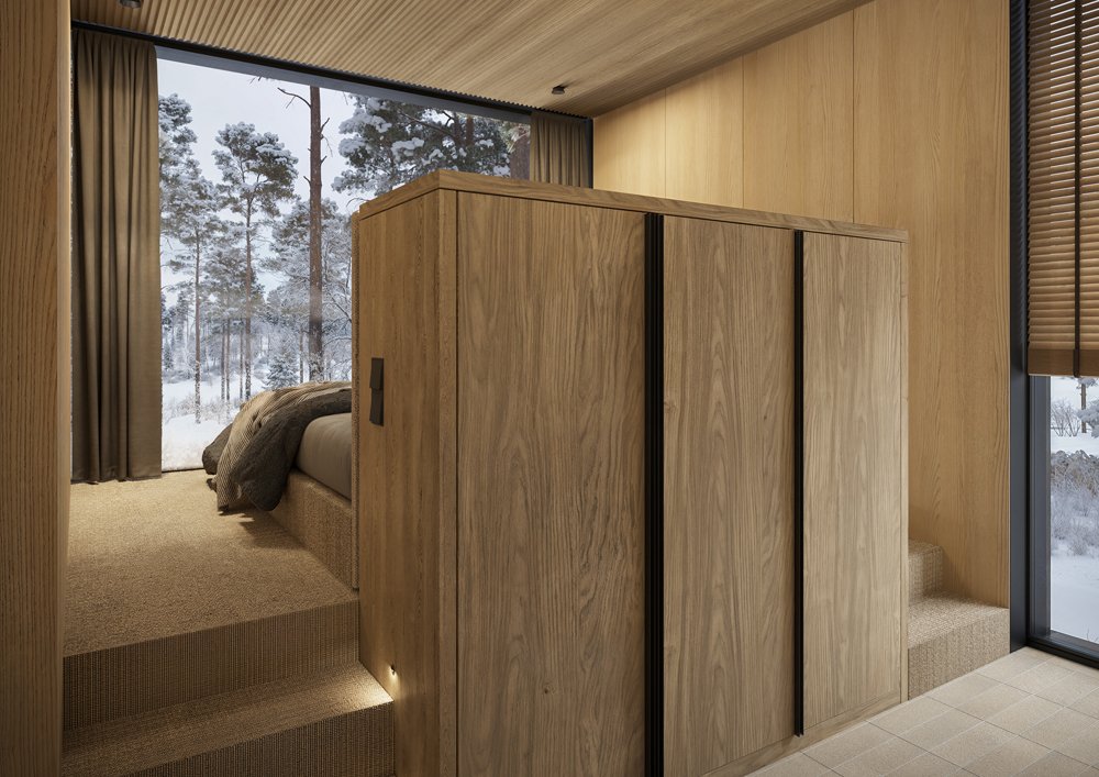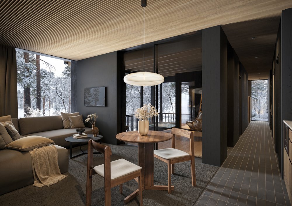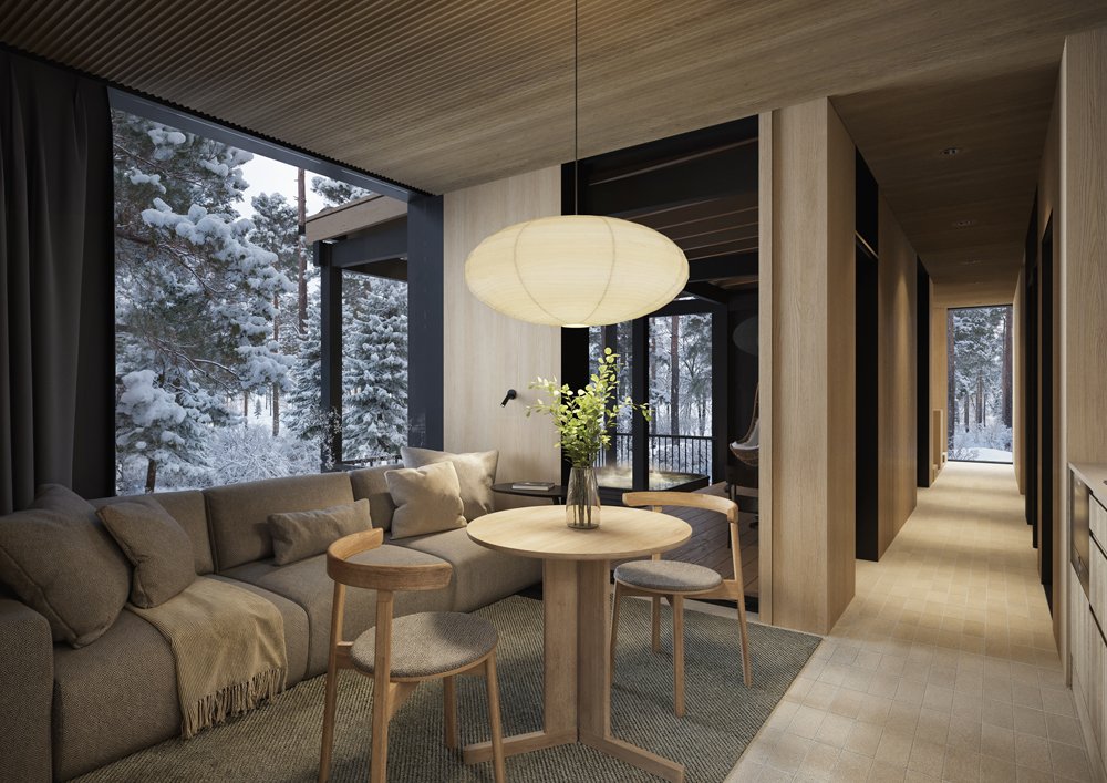 The Standard Villas offer a peaceful retreat that blends comfort with simplicity, creating a seamless connection to Lapland’s natural surroundings. Each 50 m² villa features a private terrace overlooking the forest or river, with lounge and sleeping areas framed by panoramic glass walls that bring nature in. Designed with minimalist Scandinavian style and natural wood accents, the villas include refined bathrooms with walk-in showers. Select units adapted for guests with movement disabilities.