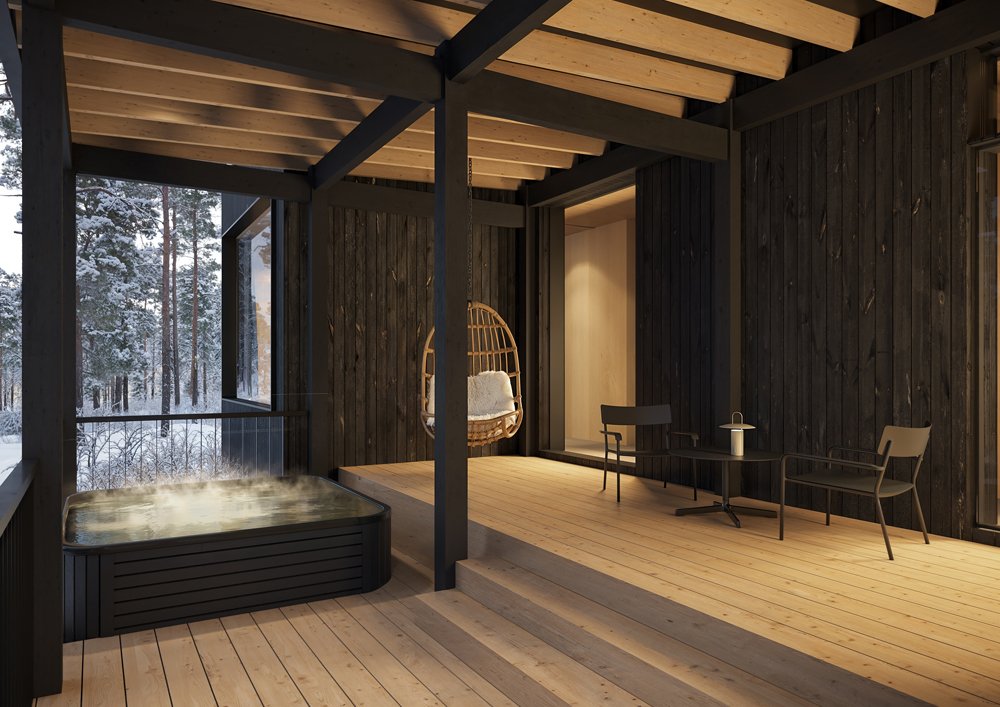 The Deluxe Villas offer an intimate and secluded escape where modern comfort blends seamlessly with the untouched beauty of Lapland. Each 57 m² villa features a private panoramic sauna, expansive terrace, and outdoor jacuzzi, creating a tranquil space to unwind while surrounded by serene river views and ancient forests. Floor-to-ceiling windows bring nature closer, while refined Nordic design and natural materials infuse every detail with warmth and harmony.