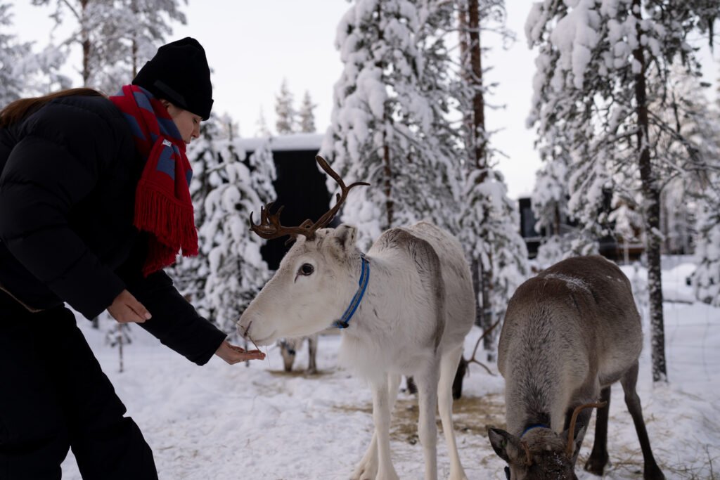 Rentiere sind ein ikonisches Symbol Lapplands, und hier haben Sie gelegentlich die seltene Gelegenheit, sie in ihrer natürlichen Umgebung aus nächster Nähe zu erleben. Fahren Sie durch den verschneiten Wald in einem von einem Schneemobil gezogenen Schlitten zu einer ruhigen Rentierherde. Füttern Sie die Tiere, wärmen Sie sich am knisternden Lagerfeuer bei einem leichten Mittagessen auf und hören Sie Geschichten über das traditionelle Leben in Lappland. Das ist ein wirklich einzigartiges Erlebnis. Rentiere gehören auch zu unserer Umgebung und sind oft in der Nähe zu sehen, während Sie diese geführte Tour weiter hinausführt und einen unvergesslichen Besuch ermöglicht.