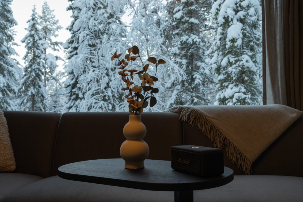 Umgeben von einem ruhigen Wald und einem fließenden Fluss lädt die Superior Villa Sie ein, Lappland in Komfort und Stil zu erleben. Weitläufige Glaswände umrahmen die Schönheit der Landschaft und verbinden mühelos den Innenraum mit der unberührten Natur draußen.