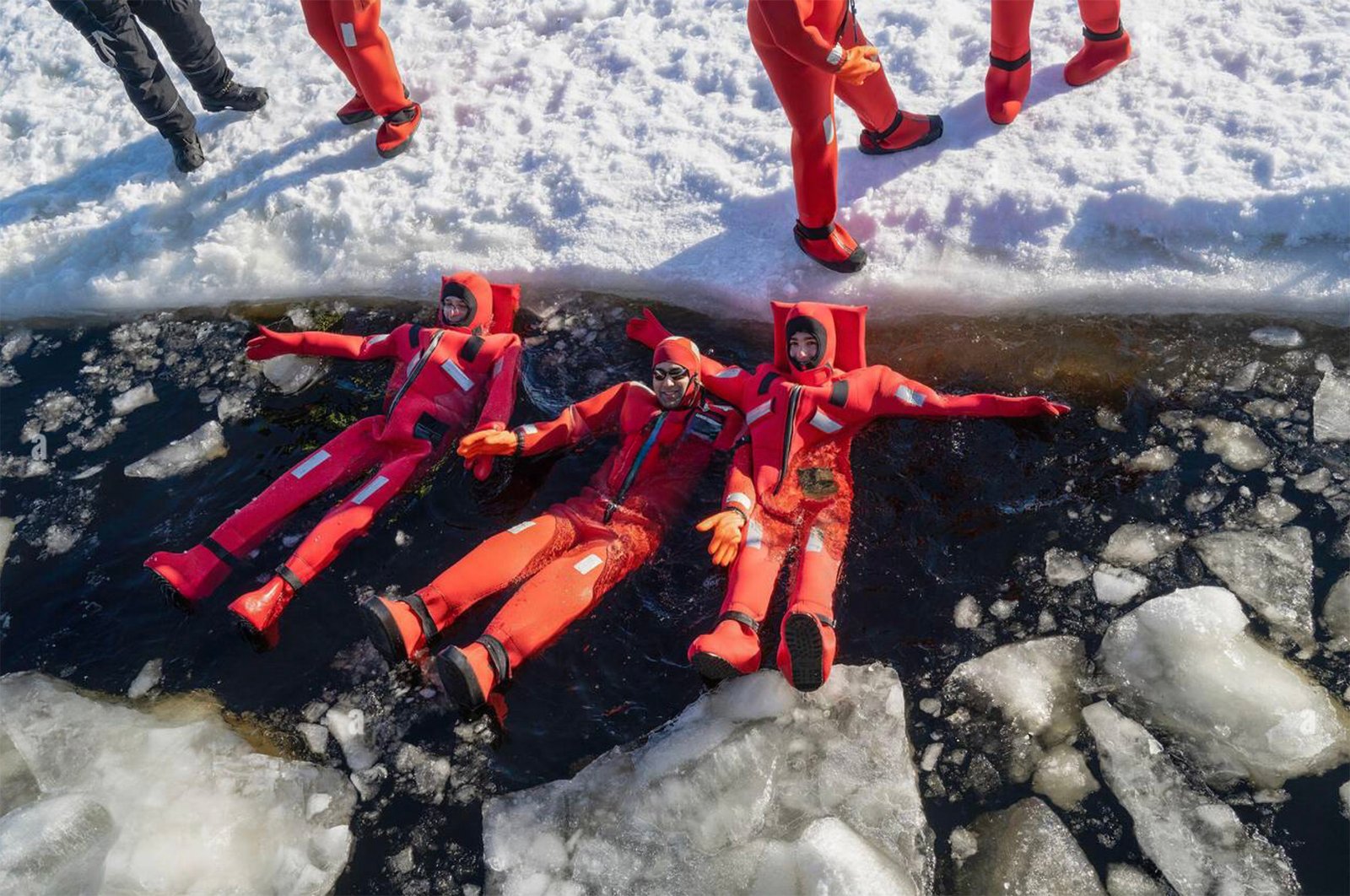 Ice floating is a relaxing Arctic experience where you drift in a frozen lake while wearing a warm, waterproof rescue suit. The suit keeps your body completely dry and insulated, allowing you to float safely among the ice while enjoying the silence and snowy scenery.
