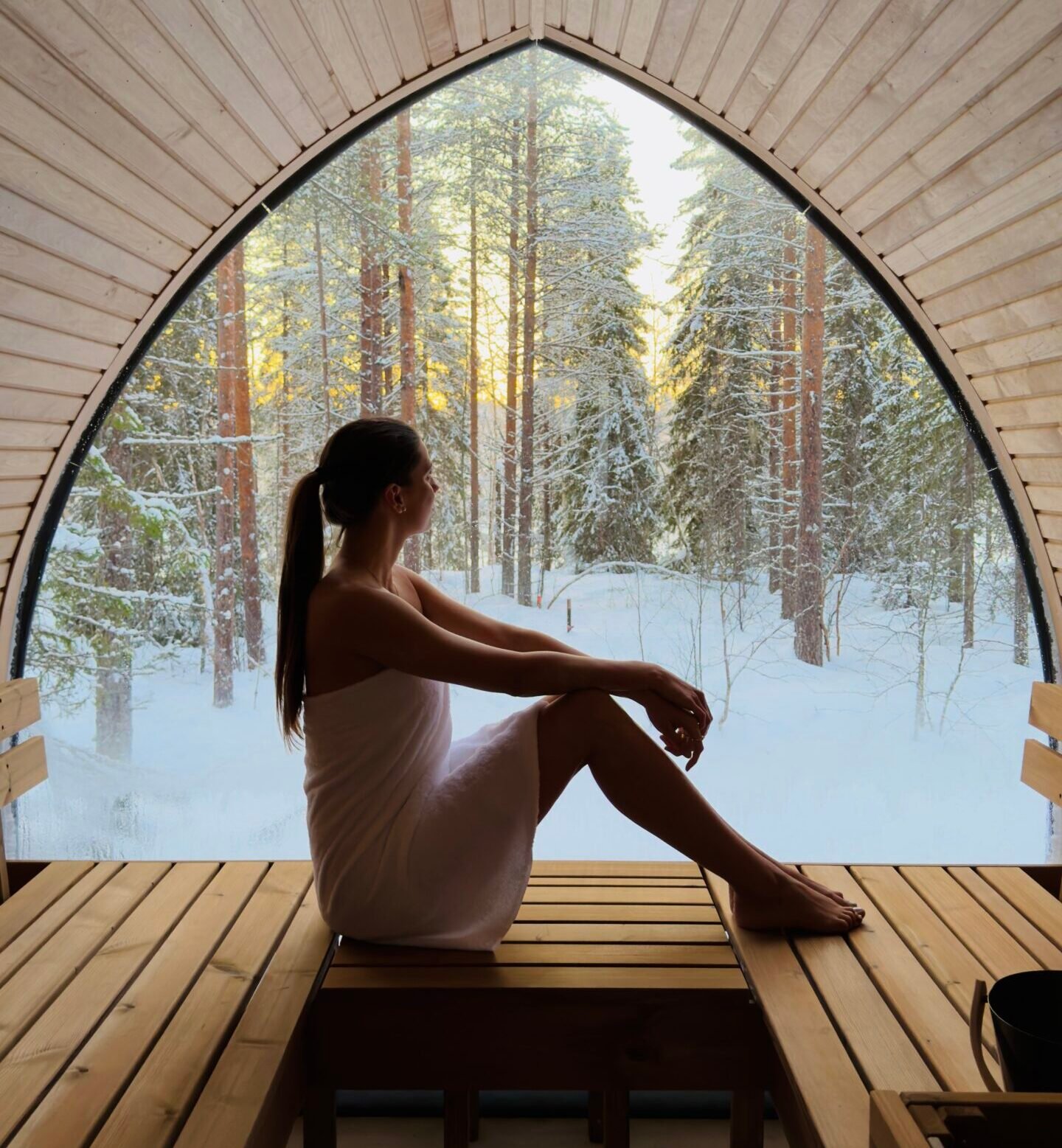 Détendez-vous dans votre sauna et bain à remous privés tout en admirant la nature et le ciel nordique
