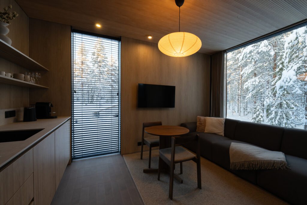 Surrounded by serene forest and flowing river, the Superior Villa invites you to experience Lapland in comfort and style. Expansive glass walls frame the beauty of the landscape, effortlessly blending the indoors with the untouched nature outside.