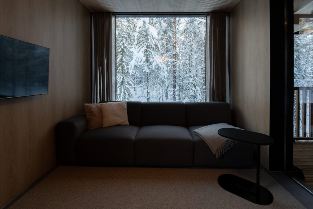 The Standard Villas offer a peaceful retreat that blends comfort with simplicity, creating a seamless connection to Lapland’s natural surroundings. Each 50 m² villa features a private terrace overlooking the forest or river, with lounge and sleeping areas framed by panoramic glass walls that bring nature in. Designed with minimalist Scandinavian style and natural wood accents, the villas include refined bathrooms with walk-in showers. Select units adapted for guests with movement disabilities.